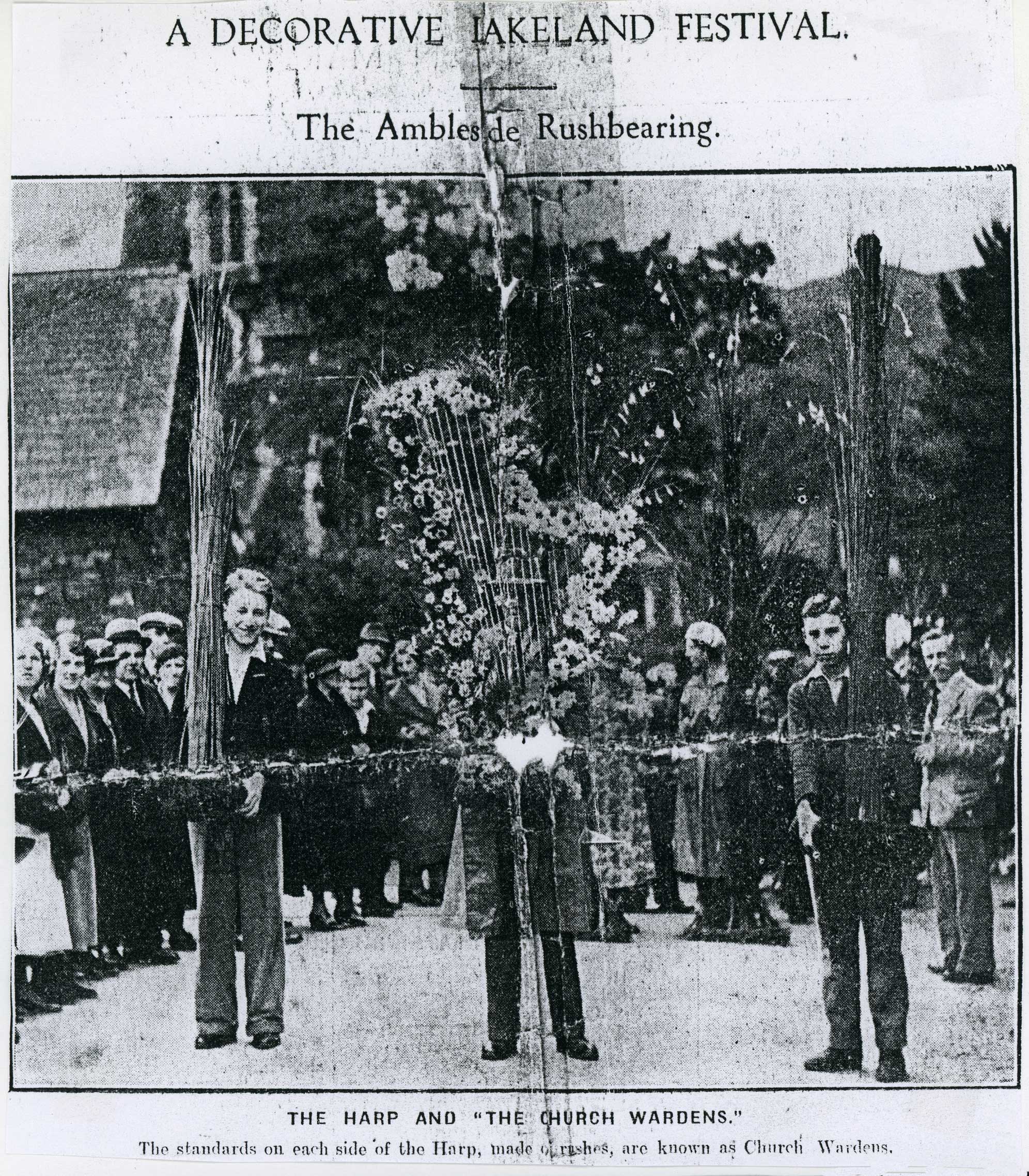 From the Lakes Herald 1936, Donated by Betty Sewell. Frank Bell & John Clark are carrying the staves. The harp appears to be decorated with daisies but the strings are made from peeled rushes as they used to be. Misses Hough and their rush poles are behind. Bystanders are, on the left, Mrs German and Mrs Brew, to the right Teddy Burrows.