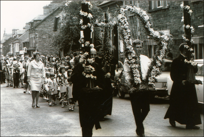 1968 Michael Prickett with the harp. Canon Morton and Mr Tointon with the Churchwarden's Staves. Mr Abbott following and Mary Hallatch leading the small children. Donated by John Prickett.