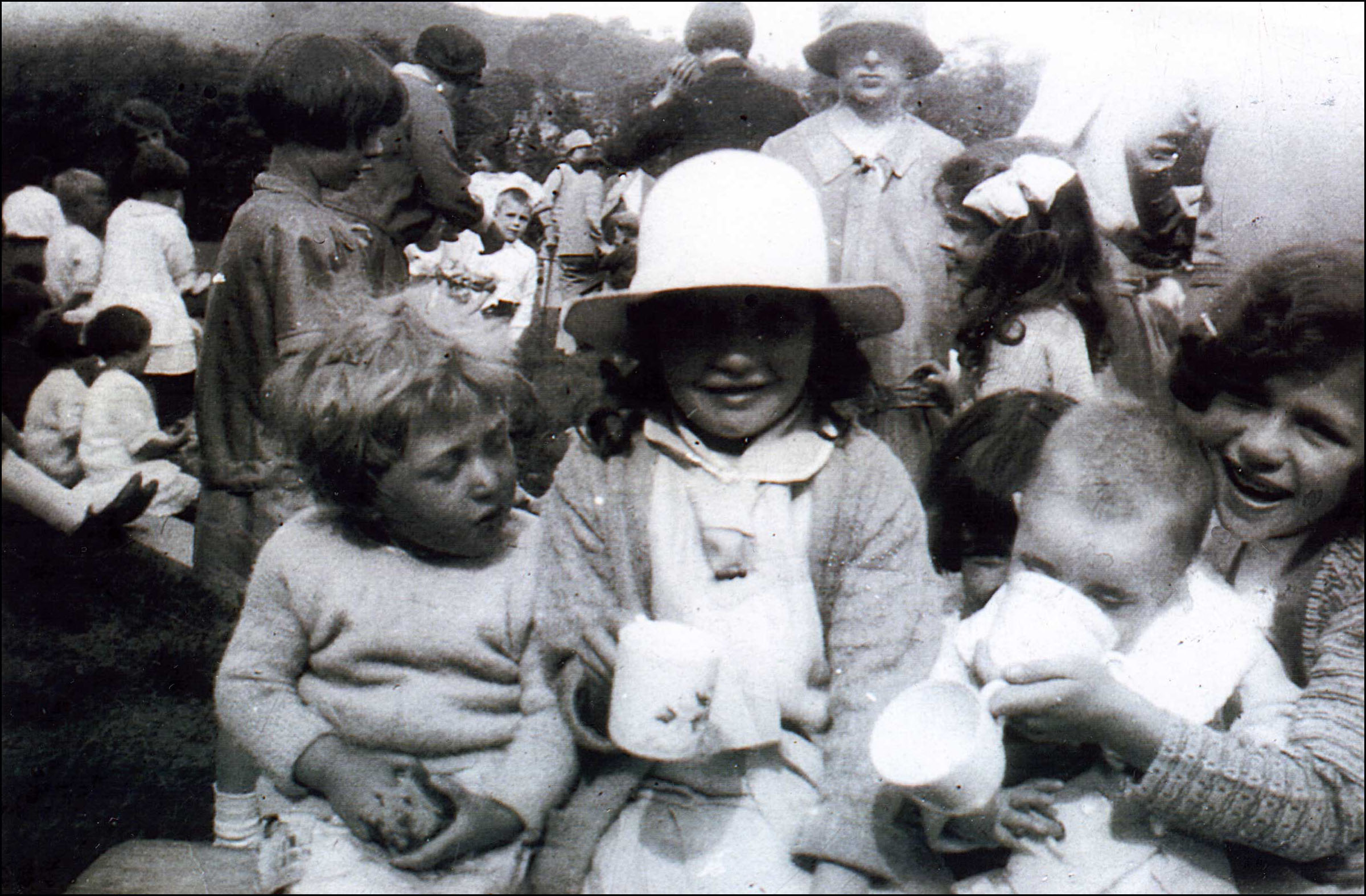 Rushbearing Tea about 1929. Jack Muir, Peggy Langdon, Irene Atkinson (nee Woodburn) giving Edward Flitters a drink. Children sat on forms in the park. They took their own mugs, had sweet tea, ate teacakes, sticky buns and cakes. Irene Atkinson in the 60's & 70's became TC Teas, taking over from her mother.
