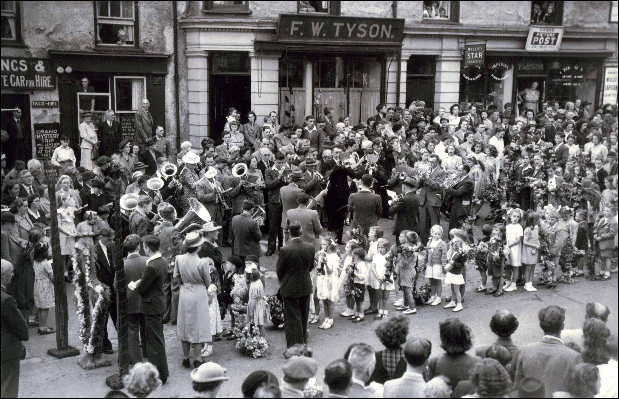 1948 Miss Routledge and Miss Thomas. Harp carried by David Stephenson. Church Wardens by Wilf Atkinson and Tony Pearce. Picture courtesy of Ann Dugdale.