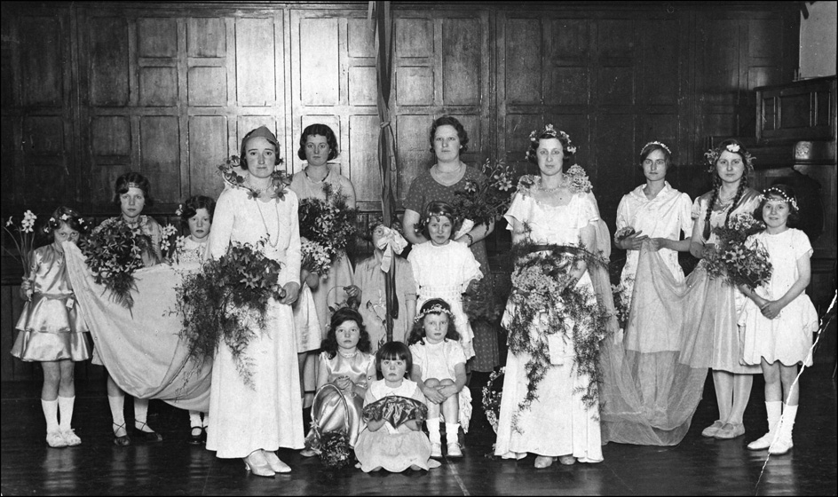 1930 This is Joan's earlist photograph. Mildred Dixon is the new Queen on the left - Grace Thistlethwaite the retiring Queen. It was in the YMCA, Now the Kelsick Centre. Also in the group is Irene Woodburn, Margaret Joiner, Hilda Dixon, Ruth Shuttleworth and Margaret Mackereth.