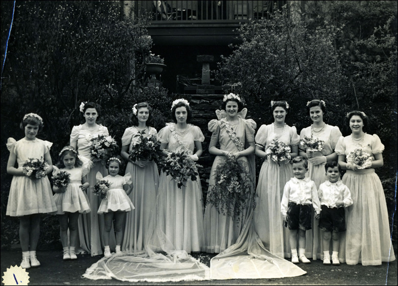 Attendants: Marjorie Frost, Eva Hesmondhalish, Wendy Coates, Train Bearers, Fiona Bell, Cherry Ostler.