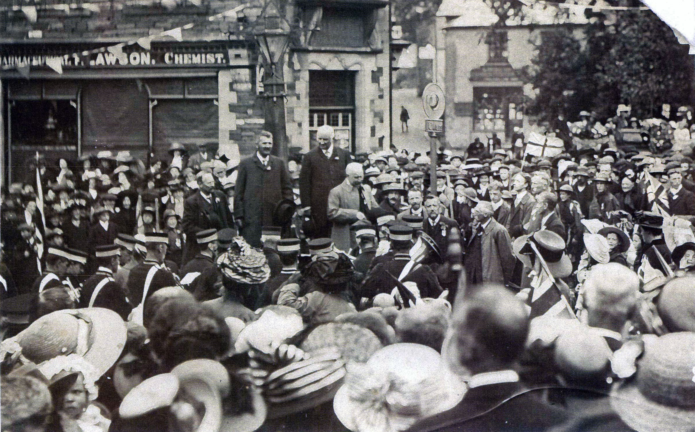 Officials addressing the crowds. Note the Market Cross used as a street light.