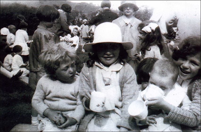 Rushbearing Tea about 1929. Jack Muir, Peggy Langdon, Irene Atkinson (nee Woodburn) giving Edward Flitters a drink. Children sat on forms in the park. They took their own mugs, had sweet tea, ate teacakes, sticky buns and cakes. Irene Atkinson in the 60's & 70's became TC Teas, taking over from her mother.