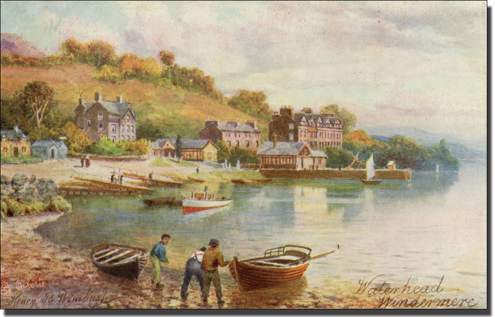 Waterhead about 1898. "You can see that only the middle four houses on our row have been built. Two were added later to each end. I think that this was also the case with the Esplanade, the bigger houses each end were later additions. The County, the steamer peir, the boatman's cottage and the boat sheds are all there." Joan Newby