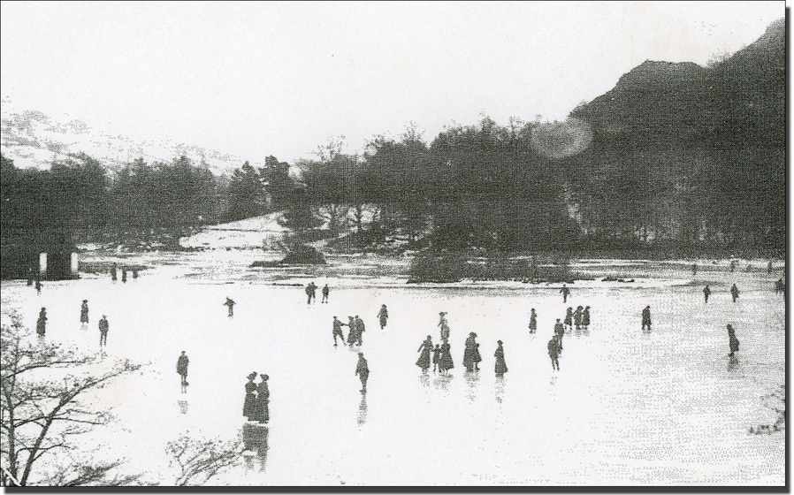 Skating on Rydal Lake about 1910. This postcard, sent from Southport in Febrary 1912, carries a request to Dr Mitchell of Rothay Garth to attend. "I'm have been poorly since I came here. The place upsets me very much. I have been miserable and want to go home at once. I do not like the burses and since I cut my head they have been dreadful with me."