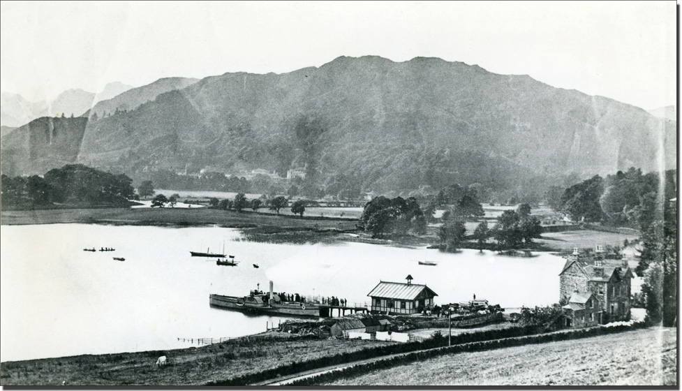 Waterhead Circa 1880. The large building on the corner has replaced the Toll Cottage. The paddle steamer "Dragonfly" was lauched in 1851. In the background is the "Wagtail", owned by David McIver MP, Wanless How.