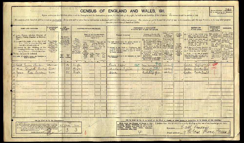 | 13 | Ancestry.com, "1911 England Census" (Name: Ancestry.com Operations, Inc.; Location: Provo, UT, USA; Date: 2011;). Class: RG14; Piece: 7207; Schedule Number: 220. Text From Source: Record for Jessie Rose Sandon |