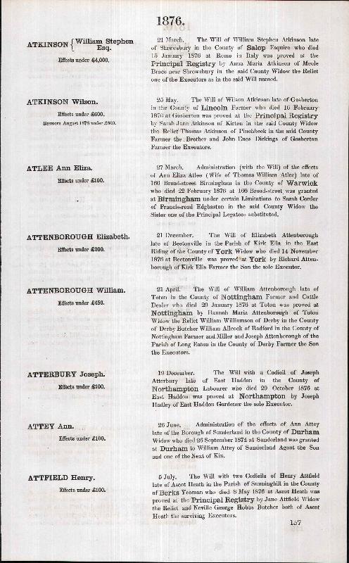 | 13 | Ancestry.com, "England & Wales, National Probate Calendar (Index of Wills and Administrations), 1858-1966" (Name: Ancestry.com Operations Inc; Location: Provo, UT, USA; Date: 2010;). |