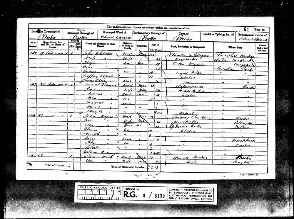 | Residence | 1861 (age 35-36) | 21 Robinson Street, Preston, Lancs5 |