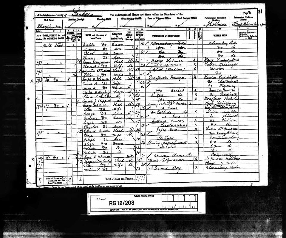 | Residence | 1891 (age 57-58) | Bloomsbury St George, London, England44 |