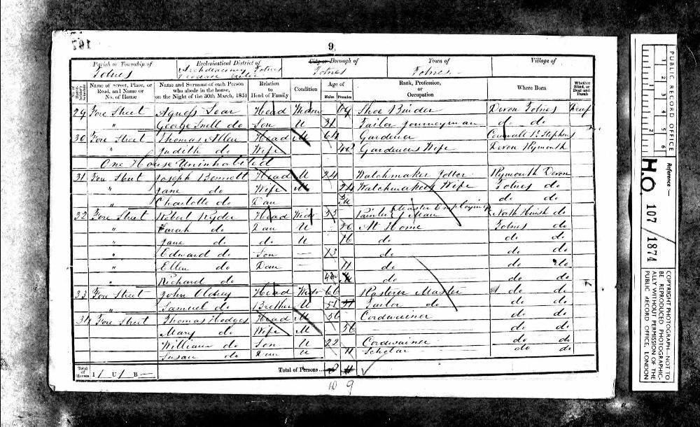 | 9 | Ancestry.com, "1851 England Census" (Name: Ancestry.com Operations Inc; Location: Provo, UT, USA; Date: 2005;). Class: HO107; Piece: 1874; Folio: 107; Page: 9; GSU roll: 221022. |