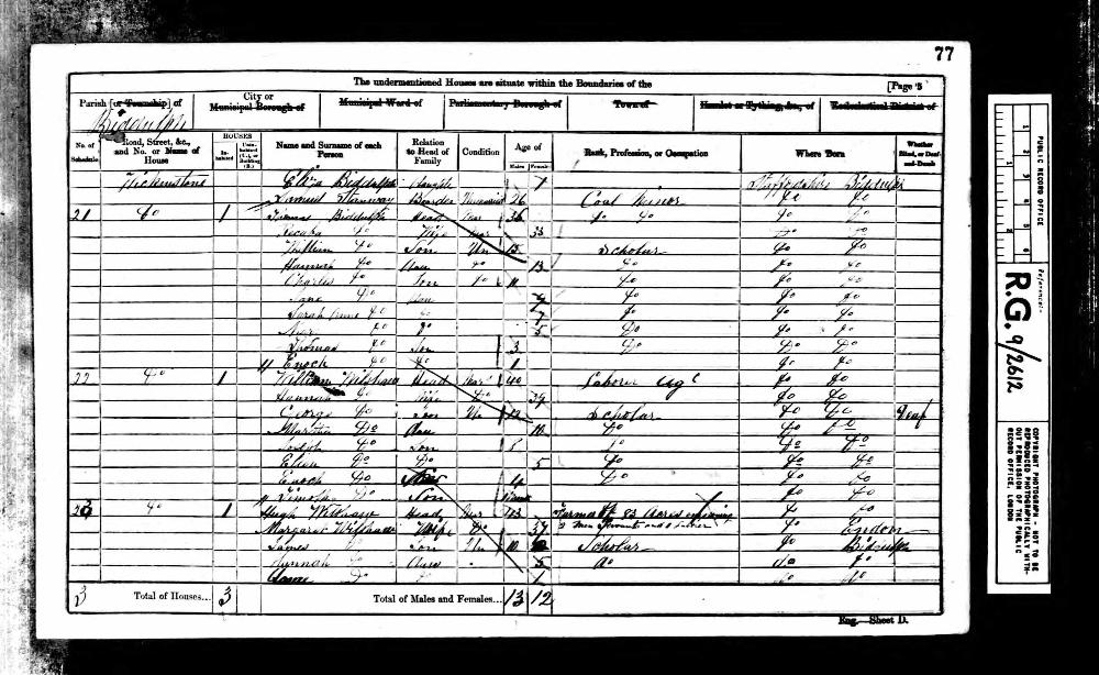 | 2 | Ancestry.com, "1861 England Census" (Name: Ancestry.com Operations Inc; Location: Provo, UT, USA; Date: 2005;). Class: RG 9; Piece: 2612; Folio: 77; Page: 5; GSU roll: 542999. |