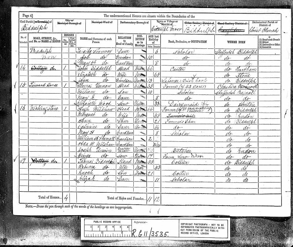| Residence | 1871 (age 11-12) | Biddulph, Staffordshire, England4,9 |