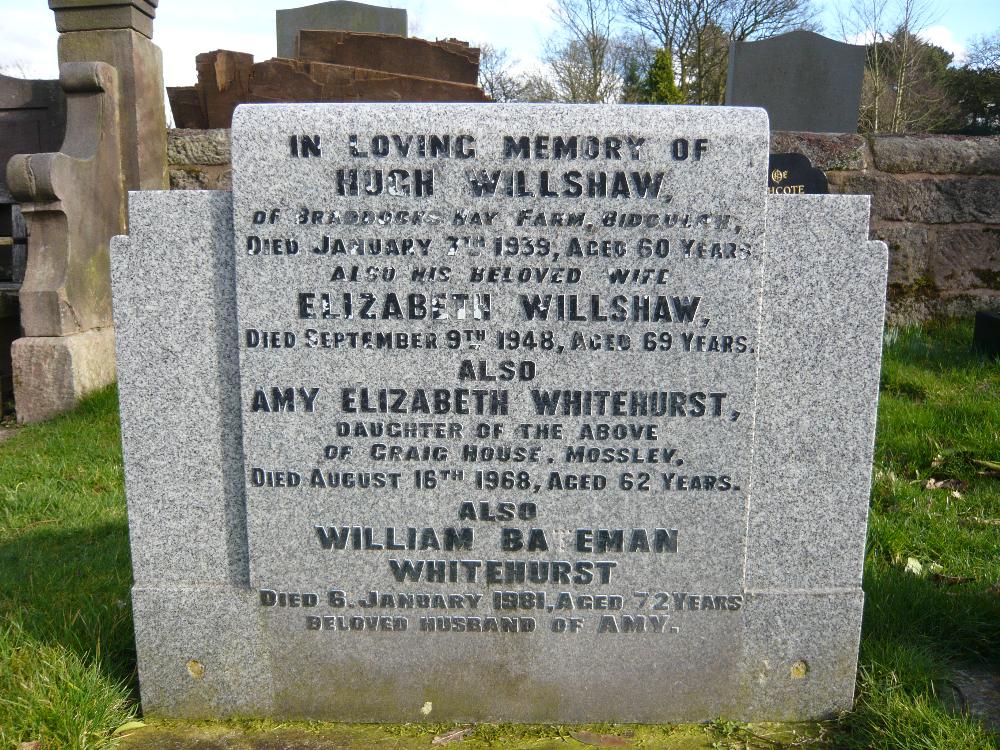 6. Hugh WILLSHAW,15,16 son of James WILLSHAW and Sarah Ann POOLE, was born on 8 December 1878 in Horton, Staffordshire, England.17,18 He was in FARMER. In 1881 he lived in Biddulph, Staffordshire, England. In 1891 he lived in Biddulph. In 1901 he lived in Biddulph.19 He married Elizabeth SHAW on 25 December 1901 in BIDDULPH CHURCH. On 2 April 1911 he lived in Biddulph.22 He died on 7 January 1939 in BRADDOCKS HAY FARM BIDDULPH. He was buried in BIDDULPH CHURCH YARD.